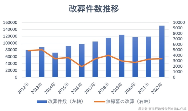 また、既存墓地が無縁墓になることを防ぐ為の手段として近年聞くことの増えた 「お墓の引っ越し」 は、増加の一途を辿っています。厚生労働省の統計によれば、2012年に7万9千件ほどだった改葬件数は、2022年には15万件余りに増加しています。この数値には、お墓をいわゆる “家墓” のまま移したものも含まれていますが、代々継いでいくことを前提としない 「墓じまい」 をしたケースが多分に含まれていると推測されます。