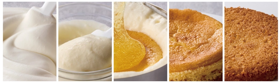 ミルクの濃厚な味わいに北海道産マスカルポーネを隠し味に加え、より一層ミルクが感じられるコクと深みのある“濃厚仕立て”のソフトクリームに、北海道産の生クリームをあわせて、ふんわりと泡立てました。まるでソフトクリームのような、とろけるようななめらかさの特製クリームの下には、やさしい味わいのチーズムース、濃厚なベイクドチーズケーキ、アーモンドタルトを重ね、雪のように真っ白なケーキにナイフを入れると、中から黄金色のはちみつがとろりとあふれ出します。5つの層が口の中でひとつに溶け合う至福のひとときをお楽しみください。