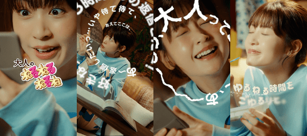 今回、「スマホ時代の大人のあるある」2つに焦点をあて、ねるねるねるねを作って食べることで心がほぐれる時間(=ゆるねる時間)にしてほしいという思いで制作しました。仕事に家事・育児とマルチタスクに追われ、デジタルデバイスに囲まれた大人の生活に、他のことをやめて「ねるねるねるね」だけをするアナログな時間をとることをおすすめするメッセージを発信しています。
