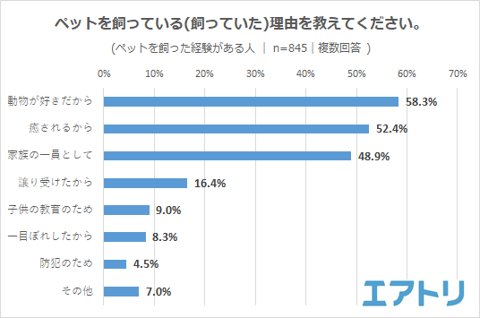 ペットを飼っている最多理由は「動物が好きだから」が58.3%、次いで「癒されるから」が52.4%、「家族の一員として」が48.9%となりました。その他の理由として多く上げられたのは「捨てられていて放って置けなかった」でした。
