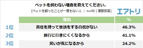 最も多かった理由1 位は「責任を持って世話をする自信がない(46.3%)」となりました。2 位が「旅行に行きにくくなるから(41.1%)」、3 位が「臭いが気になるから(24.2%)」でした。