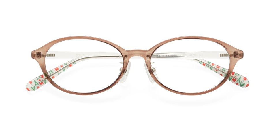 メタルとプラスチックのコンビネーションフレーム。テンプルはグラスをイメージしたクリアベースに仕上げ、先端にアデリアグラスの代表的なモチーフをプリントしています。レンズまわりのプラスチック部分は植物由来成分が含まれたエコ素材を使用しています。