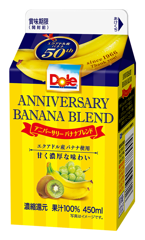『Dole(R) ANNIVERSARY BANANA BLEND 100%』今年、Dole(R)が日本でバナナの輸入・販売をスタートして50周年を迎えます。現在日本で流通しているバナナの9割はフィリピン産※ですが、当時Dole(R)はエクアドル産バナナの輸入・販売からスタートしました。 ※出典:平成25年財務省貿易統計