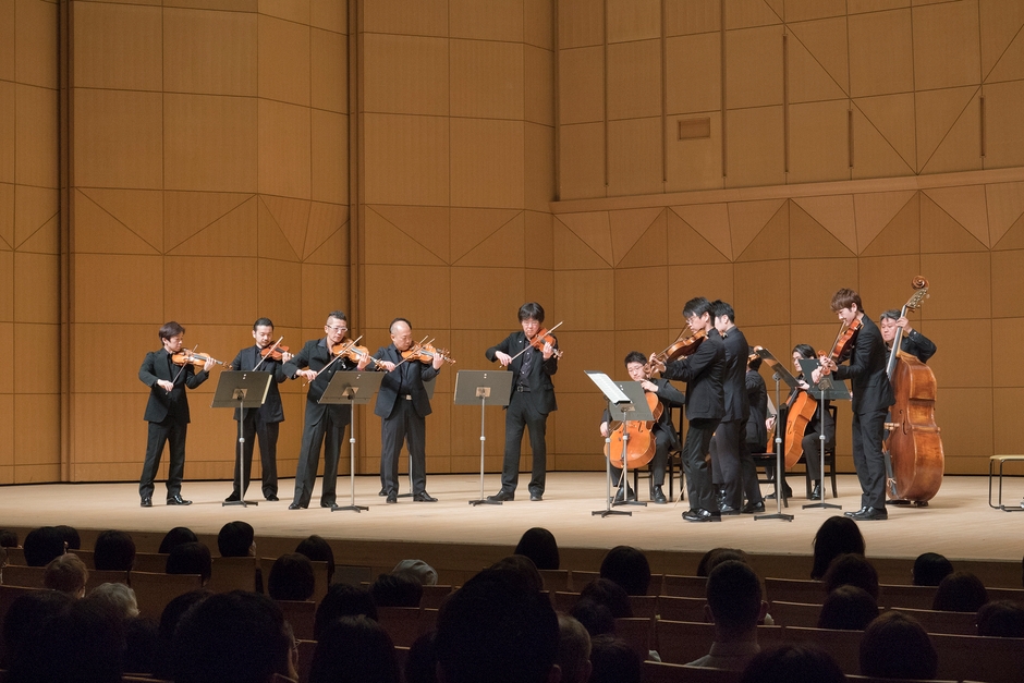 「硬派弦楽アンサンブル」の通り名よろしく、石田以下メンバー(組員)は全員黒一色のスーツで舞台に現れた。それぞれの演奏位置に立って客席と向き合うだけで所謂クラシックコンサートとはまるで異なる雰囲気を放つ。編成は第一および第二ヴァイオリン、ヴィオラ、チェロ各3名にコントラバス1名と弦楽合奏にしては比較的小規模。