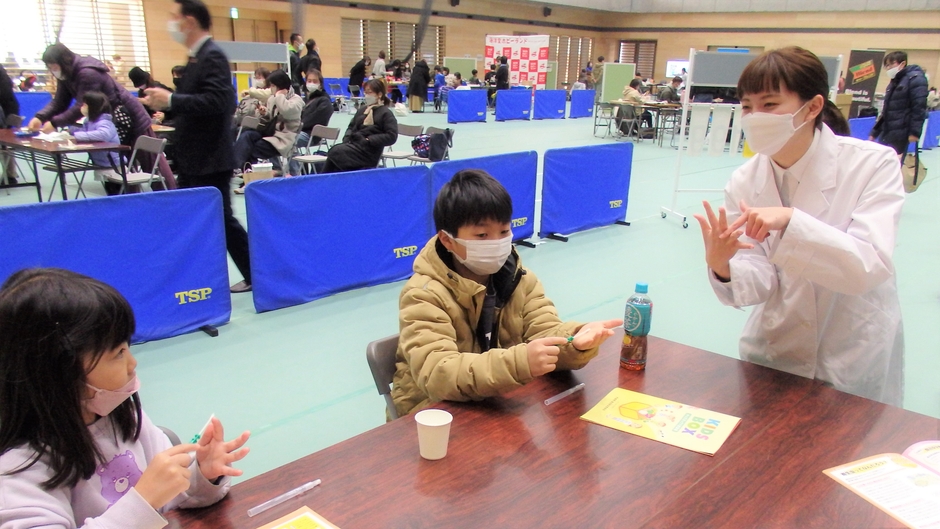 栄養学科の学生によるイベントを実施しました。海老澤セミナーでは食品の安全についてクイズと実験をおこないました。実験では汚れを数値化できる機械を用いて手洗いをする前と後での汚れを測定しました。