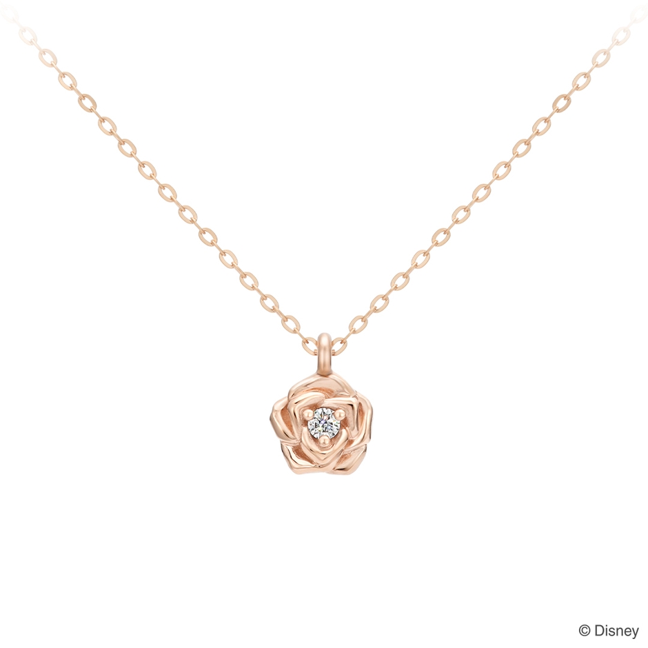 ベルと野獣を真実の愛へと導いた魔法のバラをモチーフに。18金ピンクゴールドとダイヤモンドの上質な輝きが、胸元に気品と華やぎを添えます。あらゆる角度から見て美しいよう、細部にいたるまで精巧に表現したジュエリー。