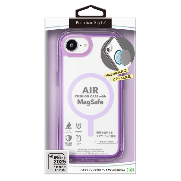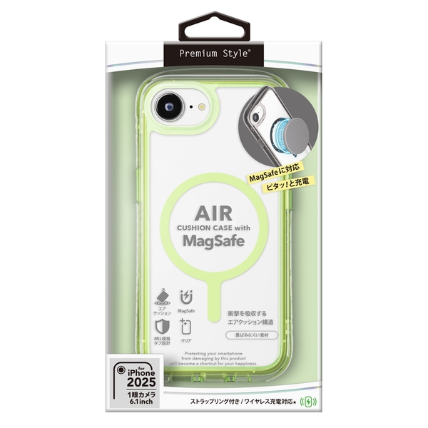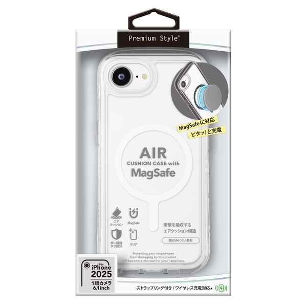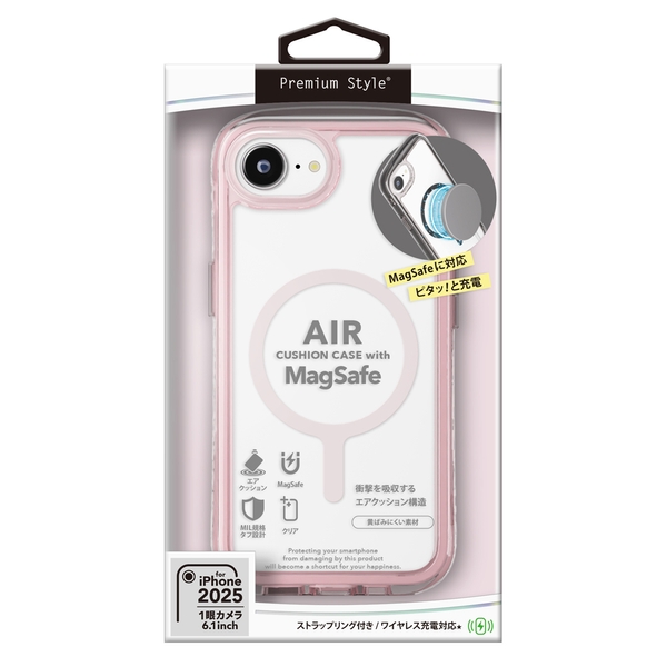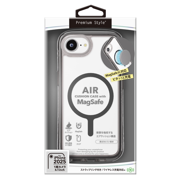 各種MagSafeアクセサリーに対応した360°エアクッション構造でiPhone本体を衝撃から守るiPhone 16e対応のエアクッションケースです。