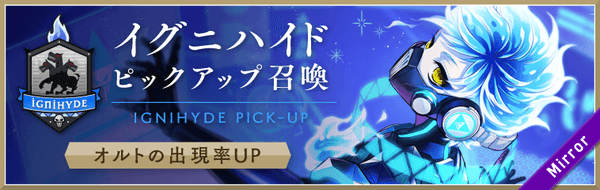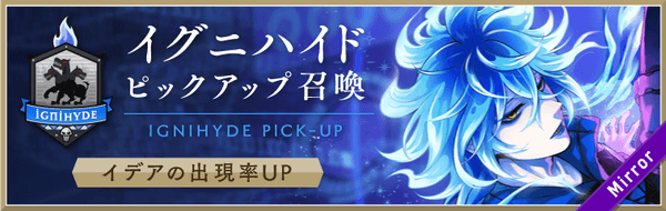 「イグニハイド ピックアップ召喚」では、ピックアップ対象のキャラクターの提供割合が、同じレアリティの他キャラクターよりもアップいたします。