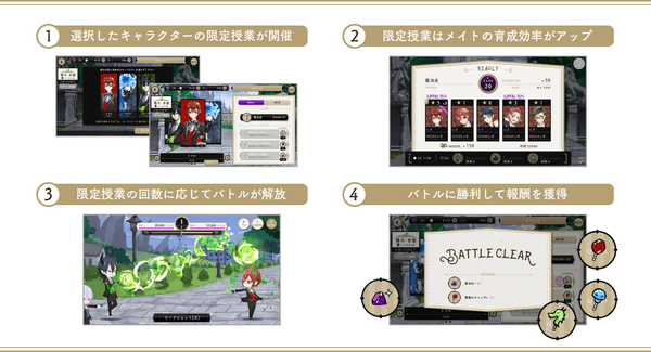 ②3キャラクターの中から育成したいキャラクター(メイト)を選択し、期間限定授業(魔法史・飛行術)を受けましょう。