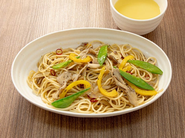 大きくカットした色とりどりの野菜ときのこをたっぷり使用しており、具沢山で華やかなペペロンチーノ。