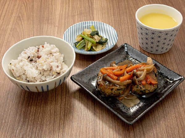 大きくカットした人参&きのこたっぷりの和風あんかけソースと、ひじきの風味が香るふわふわとした柔らかな豆腐ハンバーグがベストマッチ。