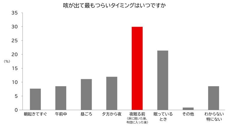 秋に咳が出てつらい人を対象に、最もつらいタイミングの調査をしたところ、「夜眠る前」であることがわかりました。