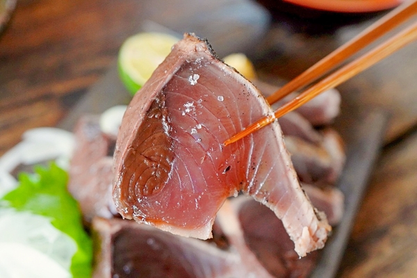 鰹のタタキは、一本釣りした鰹を船上で冷凍したものを使用しているので、臭みもなく鮮度抜群!わら焼きの香ばしさが鰹の旨みとマッチしておいしいのはもちろん、付属の海水から作った特別な塩をまぶして食べれば、さらに旨みが引き立ちますよ。