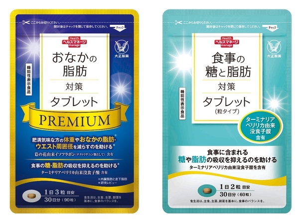 大正製薬株式会社[本社:東京都豊島区 社長:上原 茂](以下、当社)は、健康食品「ヘルスマネージ」シリーズから、機能性表示食品の「おなかの脂肪対策タブレットPREMIUM(粒タイプ)」と「食事の糖と脂肪対策タブレット(粒タイプ)」の2品を7月29日(月)より、当社通販サイト『大正製薬ダイレクト』にて発売いたします。