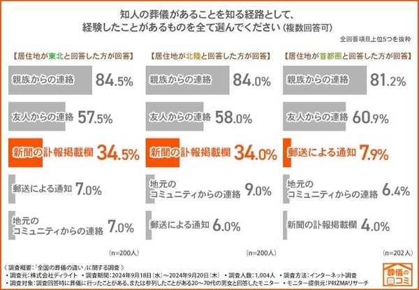 「知人の葬儀があることを知る経路として、経験したことがあるものを全て選んでください(複数回答可)」と質問したところ、東北地方・北陸地方・首都圏・関西地方・九州地方で以下のような回答になりました。