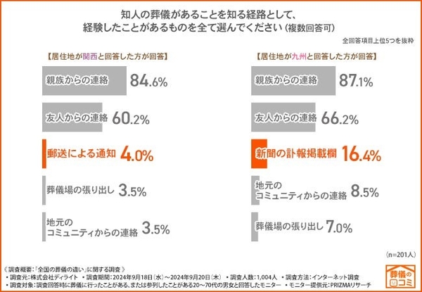 首都圏では新聞の訃報掲載欄が4%にとどまったこと、関西では上位に入ってこなかったことから、新聞購読率の低下やコミュニティの規模と結びつきの違いがみられる結果となりました。