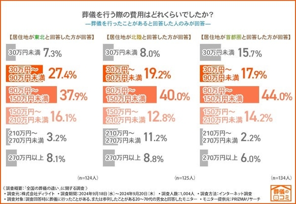 葬儀を行ったことがあると回答した人のみに、「葬儀を行う際の費用はどれくらいでしたか?」と質問したところ、東北地方・北陸地方・首都圏・関西地方・九州地方で以下のような回答になりました。