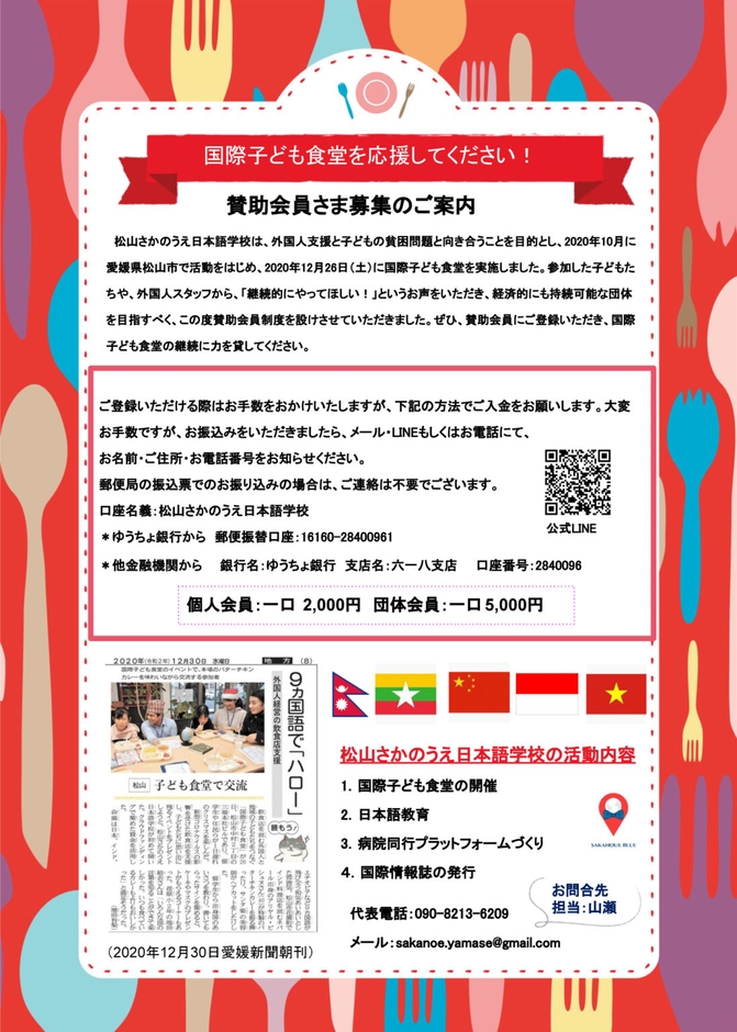 ウェルカムで国際的な松山の子ども食堂【寄付・賛助会員募集】