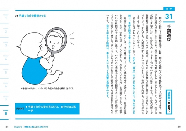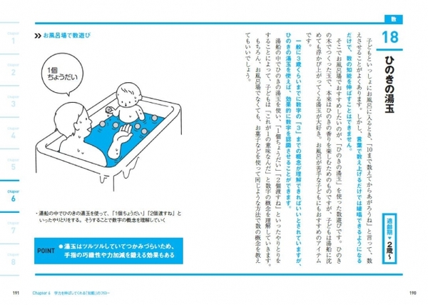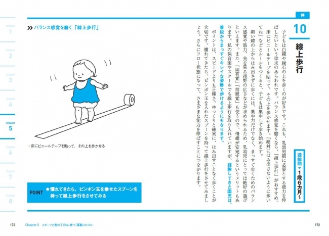 そして、5章からは、著者が9000組の親子に向け教えてきた、「運動」「知能」「感性」「社会性」それぞれの能力を伸ばすための、「家庭でできる40のメソッド」を、それに取り組む最適な年齢とともに一挙紹介します。