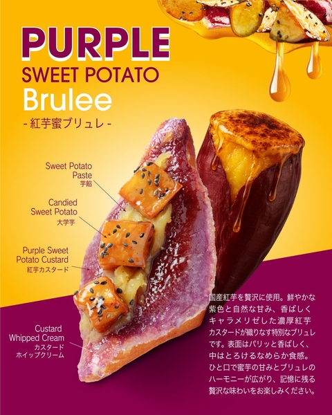 国産紅芋を贅沢に使用。鮮やかな紫色と自然な甘み、香ばしくキャラメリゼした濃厚紅芋カスタードが織りなす特別なブリュレです。