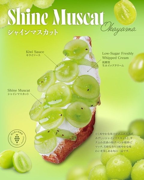 種なしで皮ごと食べられるので食べやすく、鮮やかな緑色の果実とサクふわ食感の揚げパンが絶妙に調和。岡山をはじめ各地のシャインマスカットを使用し、旬の贅沢を頬張る心ときめく一品です。
