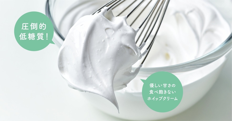 砂糖を使用せず、カロリーゼロでありながら砂糖と同じ甘さを持つ自然派甘味料「ラカント」を配合。ウリ科の植物「羅漢果(ラカンカ)」の高純度エキスと、天然甘味料成分である「エリスリトール」を絶妙なバランスで組み合わせ、砂糖に近い甘さを実現しました。さっぱりとした軽い口当たりで、最後まで食べ飽きない低糖質ホイップクリームです。