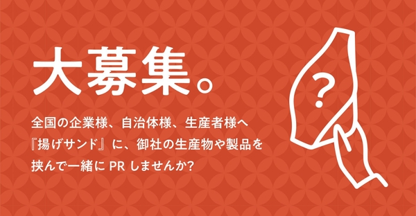 日本にはその土地々々の食材や食文化があります。全国的に有名な名物から、地元の方に愛され続ける密かな名産品まで多種多様。そんな食を作り出す企業様、生産者様と一緒に『揚げサンド』を作りたい。一緒に広めていきたいと考えております。「もしかしたら揚げたパンに挟んだら美味しいかも」「合わないかもしれないけどPRしたい」そんな企業様、生産者様は、是非ご一報ください。