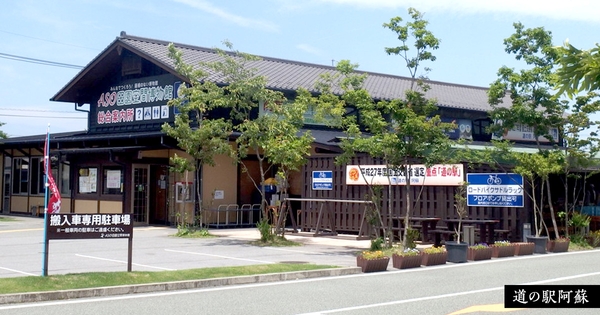 正面に雄大な阿蘇五岳を望む、熊本県阿蘇市にある道の駅。