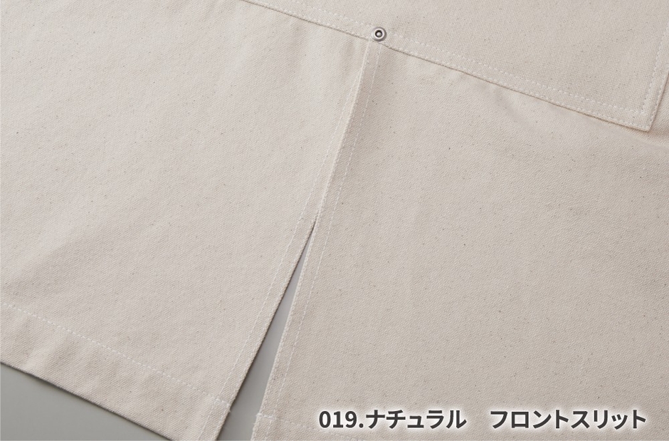 厚手で丈夫なキャンバス生地または、デニム生地を使用!フロントスリットを配置することにより引っかかりを軽減。しゃがみやすいため、キッチンからガーデニングと幅広いワークウェアとしても利用可能。