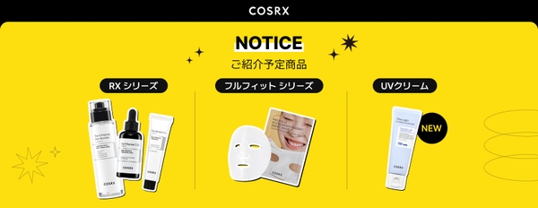 今回のイベントでは日本でもベストセラーになっているThe RXシリーズ製品である「RXザ・6ペプチドスキンブースターセラム」「RXザ・レチノール0.1クリーム」「RXザ・ビタミンC23セラム」のほか、透明感あふれる「ウルトラライト透明UVクリーム」、保湿感を長時間維持するフルフィットマスクまで5つの製品を詳しく紹介する予定です。さらに、ディスプレイゾーンでは、より様々なCOSRXの製品を体験することが出来ます。