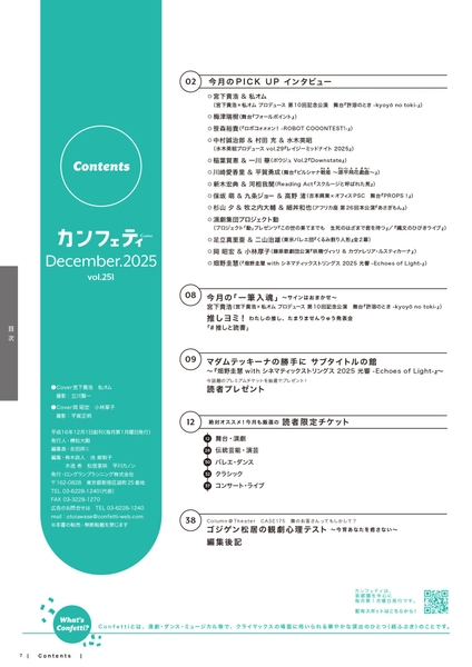 「エンタテインメントを、もっと身近なものに。」を理念とするロングランプランニング株式会社(東京都新宿区、代表:榑松大剛)は、シアター情報誌「カンフェティ」12月号 vol.251 を2025年11月3日(月)に発行いたします。配布場所は、首都圏を中心とした劇場・ショップ・駅など合計1,500箇所以上に設置されます。
