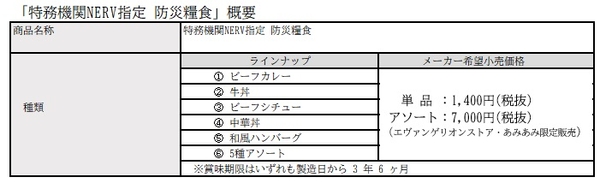 同梱の白米とおかず(ラインナップ全5種)は、レーション(配給された食糧)をイメージした包装になっており、外箱パッケージと包装には新劇場版の NERV マークと、「特務機関NERV指定 防災備蓄品」の文字が入っています。5 種をセットにした「5 種アソート」は、専用ケースに梱包してお届けします。