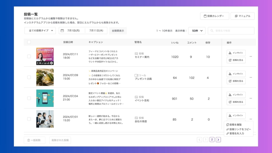 投稿機能とは、エルグラムでインスタへの投稿作成から分析までをまとめて行える機能です。