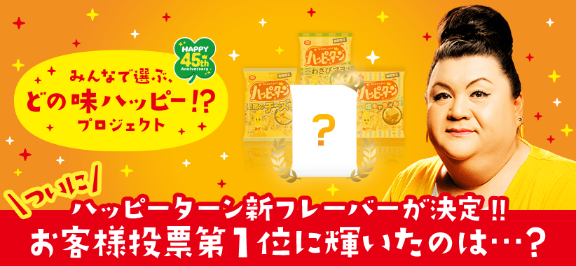 2021年8月23日(月)から9月6日(月)に実施した、「ハッピーターン」45周年!「みんなで選ぶ、どの味ハッピー!?プロジェクト」にて、亀田製菓が自信をもっておすすめする「至福のチーズ味」、「ごきげんわさびマヨ味」、「しあわせの塩キャラメル味」の3つのフレーバーからお客様に食べたいフレーバーを投票いただいた結果、総数91,595票もの多数のご応募の中で「至福のチーズ味」が42,274票を集め1位に輝きました。この結果を受け、お客様の声から生まれた『ハッピーターン 至福のチーズ味』を発売いたします。