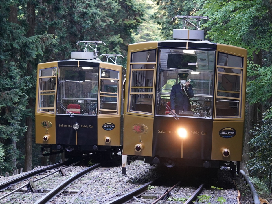 石積みのある門前町坂本と、世界文化遺産である比叡山延暦寺の表参道として、1927年(昭和2)年に敷設された坂本ケーブルは、坂本から比叡山延暦寺までの2025mを11分で結ぶ日本一長いケーブルカーです。