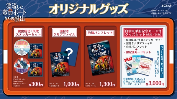 リアル脱出ゲームを企画運営する株式会社SCRAP(所在地:東京都渋谷区、代表者:加藤隆生)は、2024年4月25日(木)より開催する新作リアル脱出ゲーム『漂流した救命ボートからの脱出』の公演オリジナルグッズを販売することを発表いたします。【特設サイト: https://realdgame.jp/s/hyoryu/】