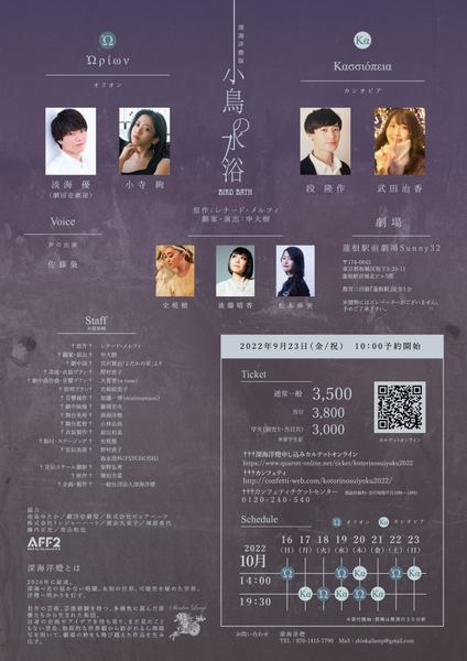 深海洋燈版『小鳥の水浴』が2022年10月16日(日)~10月23日(日)に蓮根駅前劇場Sunny32(東京都板橋区坂下2-33-11 蓮根駅前城北ビル 5 階)にて上演されます。