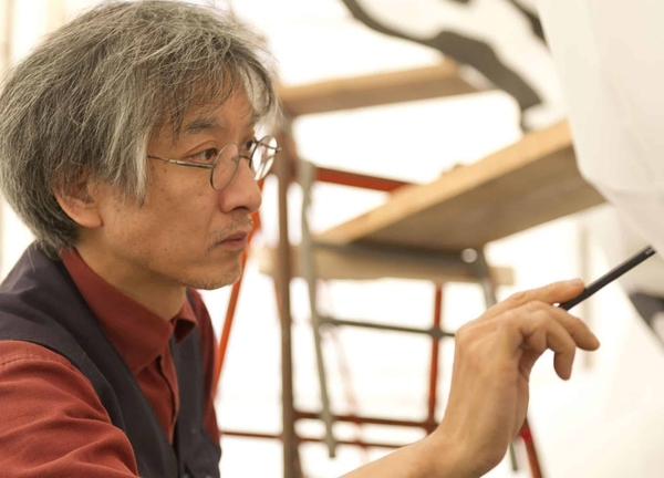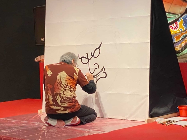 2021年12月1日、ねぶり流し灯篭10周年記念セレモニーを実施しました。開発当初から携わるねぶた師の竹浪比呂央氏を招き、当日の宿泊者約50名が見守る中、約2メートル四方の紙に今冬登場する山車の題材「雷神」のねぶた絵を、ライブパフォーマンス形式で書いていただきました。