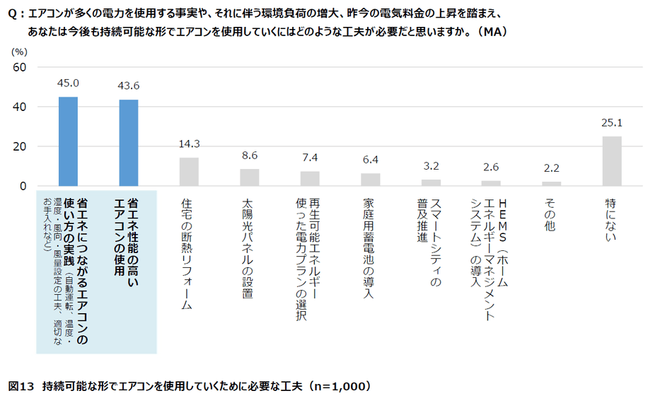生活インフラとなっているエアコンですが、その消費電力の大きさ等から環境影響を考えながら使用しないといけないことも事実です。「あなたは今後も持続可能な形でエアコンを使用していくにはどのような工夫が必要だと思いますか」と聞いたところ、運転設定やお手入れなど「省エネにつながるエアコンの使い方の実践」(45.0%)と「省エネ性能の高いエアコンの使用」(43.6%)に回答が集中しました(図13)。まずは、今あるエアコンを上手に使い、場合によっては省エネ性能の高い製品への買い替えも選択肢となっているようです。