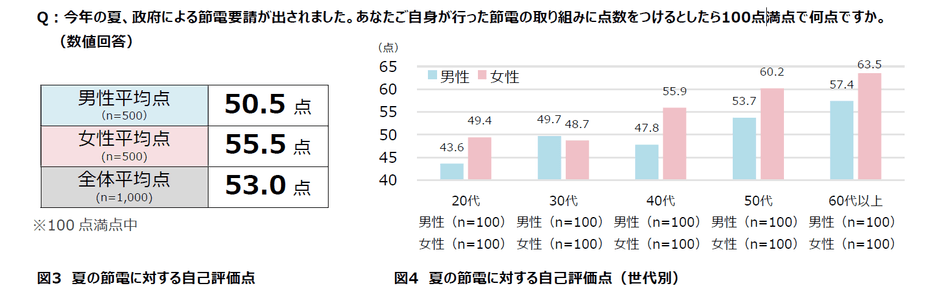電気代が値上がりし、節電要請も出された今年の夏、人々はどのくらいの節電ができていたのでしょうか。「あなたご自身が行った節電の取り組みに点数をつけるとしたら100点満点で何点ですか」と聞いたところ、全体平均で53.0点となり、低い自己評価となりました(図3)。