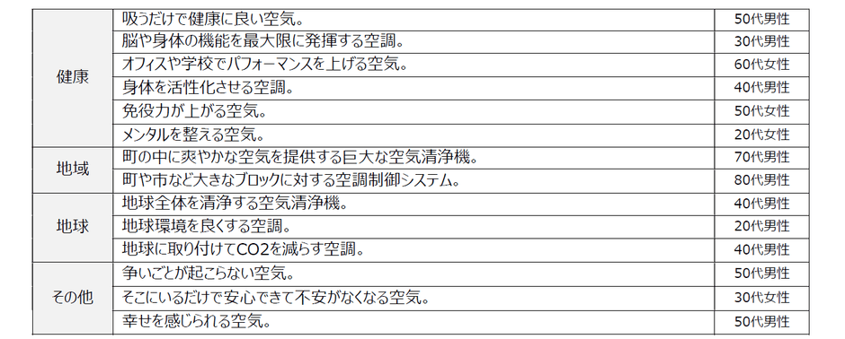 「あなたは『空気で答えを出す会社』を掲げる空調メーカーに今後どのような『答え』(空気・空調)を期待しますか」という質問に対してはさまざまな回答が寄せられました。身近な「吸うだけで健康に良い空気」から、地域・地球規模の巨大空調、世界情勢を反映した「争いごとが起こらない空気」まで、空気・空調への期待は多岐に渡っています(図23)。