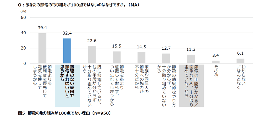 夏の節電の自己評価が低いことに対し、「あなたの節電の取り組みが100点ではないのはなぜですか」と聞いたところ、最も多かったのは「節電よりも便利さを優先して電気を使ってしまうから」でした(図5)。節電の必要性は理解しながらも、つい電気を使ってしまうというのは、とても正直な回答といえそうです。一方で、「節電をあまり意識しておらず、つい忘れてしまうから」「節電は手間がかかる/面倒なため」という人は少なく、ある程度の節電を意識しつつ、「無理のない範囲で」取り組みたいと考えている人が多いというのが実態なのかもしれません。