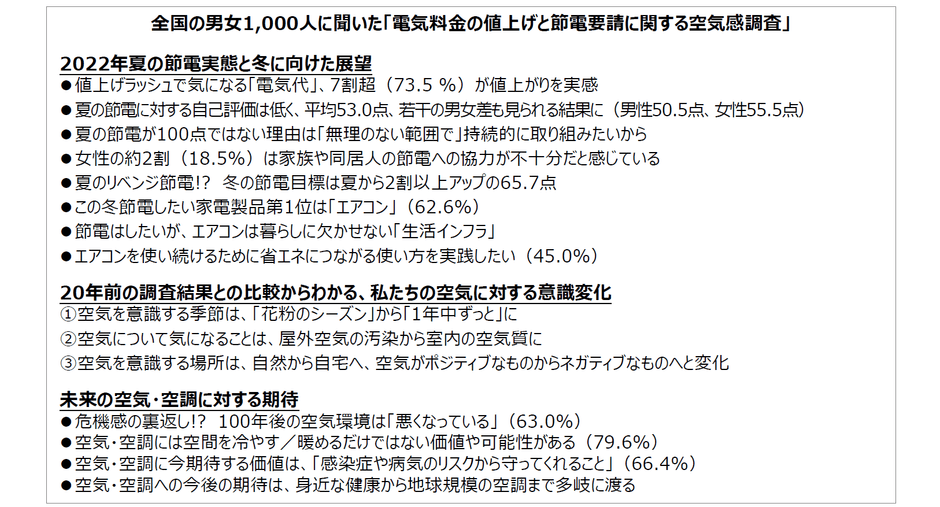 そこで28回目となる今回の空気感調査では、夏の節電実態と冬に向けた展望、さらには20年目の空気感調査だからひも解ける、空気・空調に対する意識について調査しました。その結果、夏の節電が十分に進んでいなかったことや、この冬は夏を上回る節電意向があること、生活家電の中でも特にエアコンを上手に使うことで節電につなげたいと考えていること、そしてエアコンは暮らしに欠かせない「生活インフラ」として認識されていること等がわかりました。また、空気に対する意識は、20年前は「屋外」の空気に向けられていましたが、今は「屋内」、特に自宅の空気質に向けられていて、8割近くの方が空気・空調に対して「空間を冷やす/暖めるだけではない価値や可能性がある」という期待を持っていることが分かりました。今は感染症や病気のリスクを低減してほしい気持ちが強いものの、未来に向けては生活のパフォーマンス向上につながる空気や地球環境を良くする空調など、空気の新たな可能性への期待も高まっています。