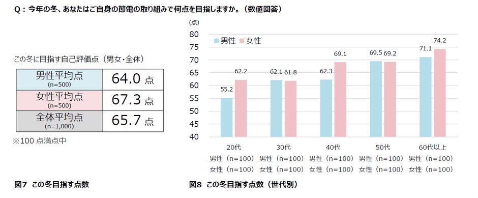 夏の節電に対する自己評価点は53.0点(図3)でしたが、節電の余地を感じている人は多いのかもしれません。「今年の冬、あなたはご自身の節電の取り組みで何点を目指しますか」と聞いたところ、夏のリベンジをしたいという思いがあるのか、目標は65.7点(全体平均)で夏を2割以上、上回る結果となりました(図7)。男女別では男性が64.0点、女性が67.3点となり、女性がわずかに上回っています。世代別では年代が高くなるほど高い目標点を掲げていることが分かります(図8)。東日本大震災による電力危機が発生した2011年夏に、節電の自己採点を尋ねたところ、平均点は68.8点でした。今回の冬の節電目標は震災時に迫る高い点数であり、節電に対する関心がかなり高まっていることを伺わせる結果となりました。