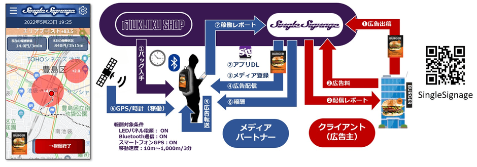 「MUKIJIKU-4DX」をはじめとするLEDバックパックに広告を表示させて報酬を獲得できるパーソナルデジタルサイネージプラットフォーム「SingleSignage」の開発を行います。