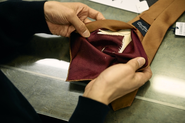 人気の理由は、その抜群の軽さにあるでしょう。裏地を潔く割愛し、大剣・小剣ともに芯地の先端部分を逆三角形の形で大きくカット(その形からツバメ芯と呼ばれます)。これにより、通常のシルクタイの約66%の重さにとどめることができました。夏場にタイを締めると首回りが暑苦しくなりますが、この軽さであれば快適に締められます。