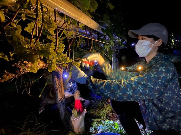 深夜に葡萄を収穫