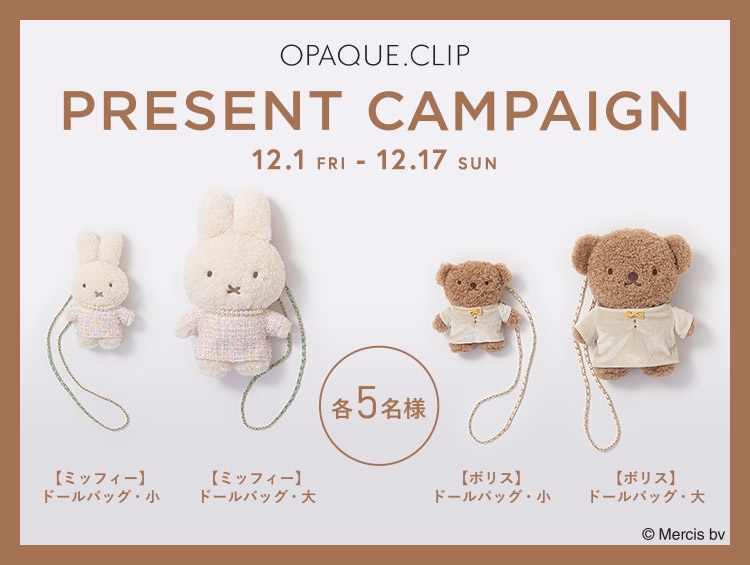 12月1日(金)~12月17日(日)のキャンペーン応募期間、「miffy×OPAQUE.CLIP」コラボアイテム取り扱い店舗およびオンラインストアにてプレゼントキャンペーンを開催いたします。