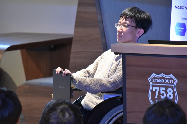 榊原さんは身体障碍者で、自らの生活で得た経験や困りごとを活かし、多くの人が暮らしやすい街づくりを行おうと、このマッチングアプリを発案。本学障がい学生支援センターで社会福祉法人や大学職員、学生約30人に協力してもらい、体験会・対話会を実施するなどしてアプリ開発に生かしました。受賞後のスピーチで榊原さんは「このように評価していただいてうれしい。皆さんのおかげです」と話していました。