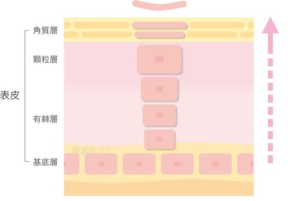 表皮では基底層で細胞が生まれ、有棘層・顆粒層へと上がるにつれて徐々に細胞は成熟していきます。